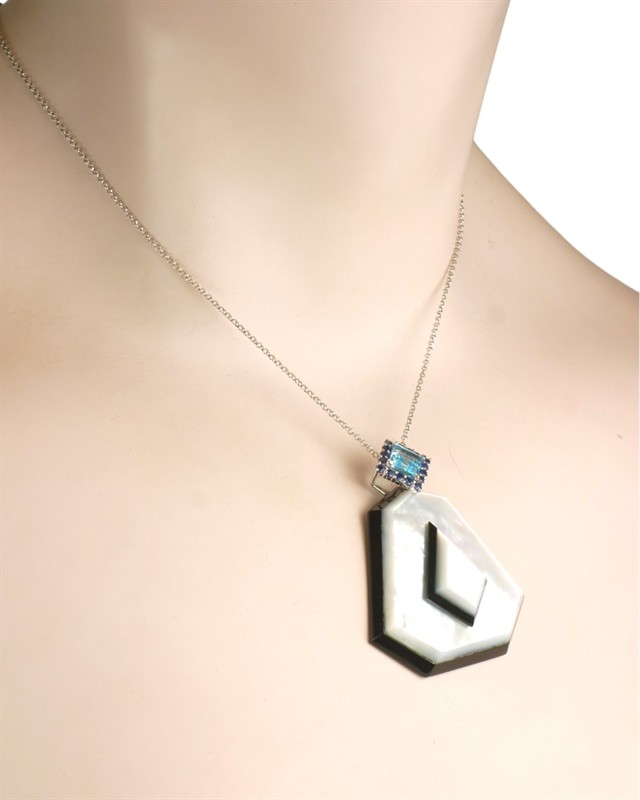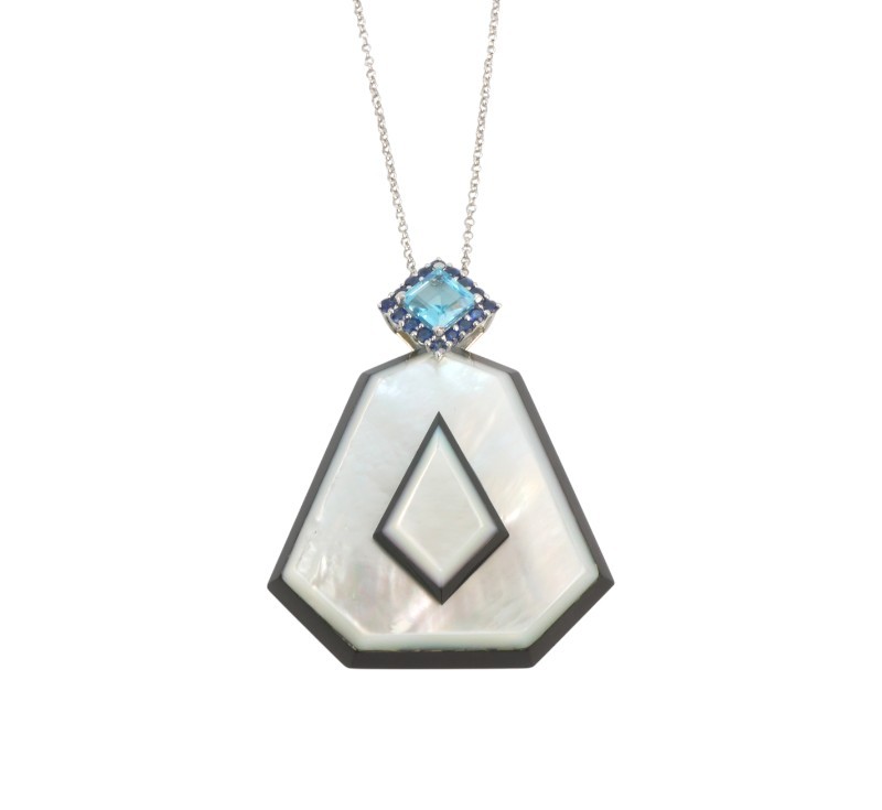 Náhrdelník z bílého zlata ryzosti 585/1000 s perletí, topazem o hmotnosti 1 ct a safíry o celkové hmotnosti 0,50 ct. Celková hmotnost šperku je 15,33 g. Délka řetízku je 45 cm. Rozměr přívěsku 3,5 x 4,5 cm.