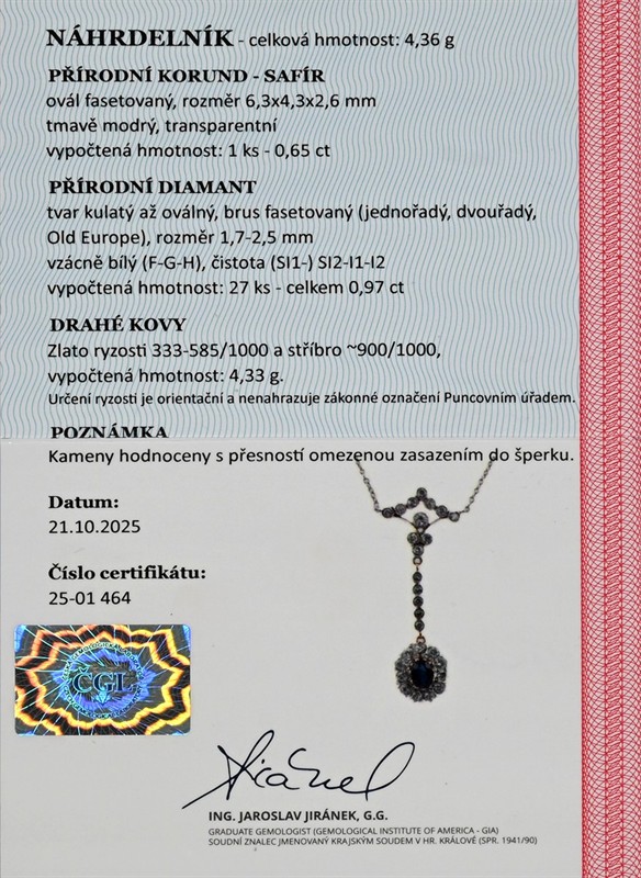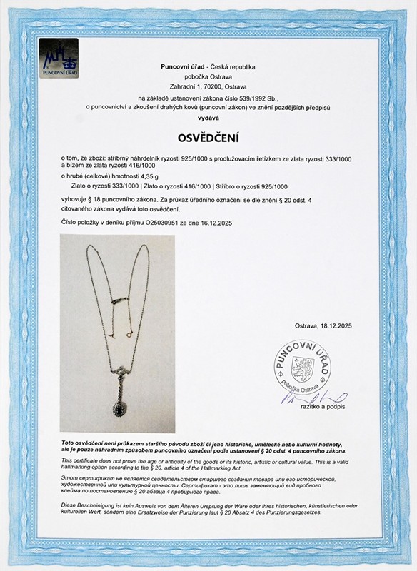Doklady: - osvědčení Puncovního úřadu České republiky -certifikát gemologické laboratoře je součástí šperku