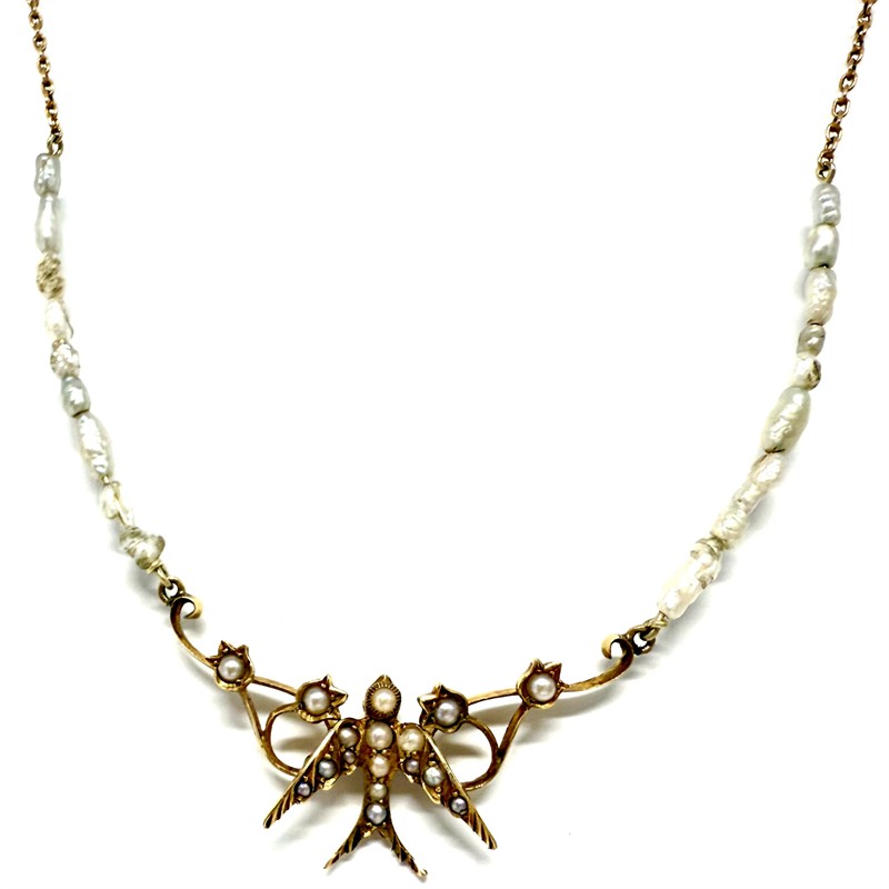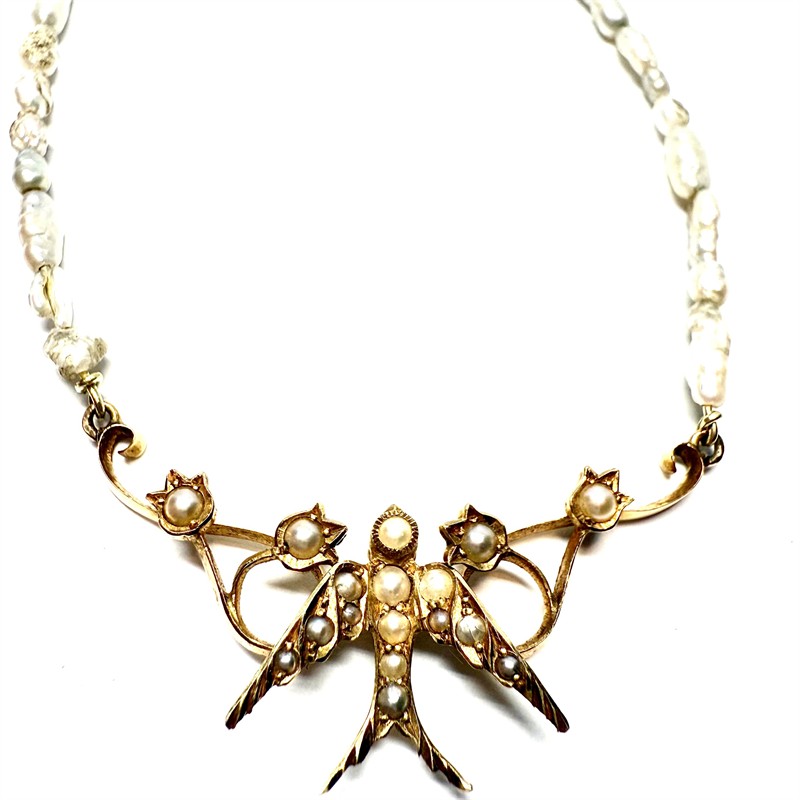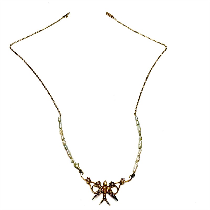Malebný, něžný, zlatý náhrdelník s motivem vlaštovky. Šperk byl vyroben z netradiční ryzosti zlata 625/1000 na konci 19.století. Zdobí jej drobné, bílé, říční perly. Zlato má sytý, tmavší odstín. Celková váha 5,07 g. Délka 43 cm .Výborný stav.