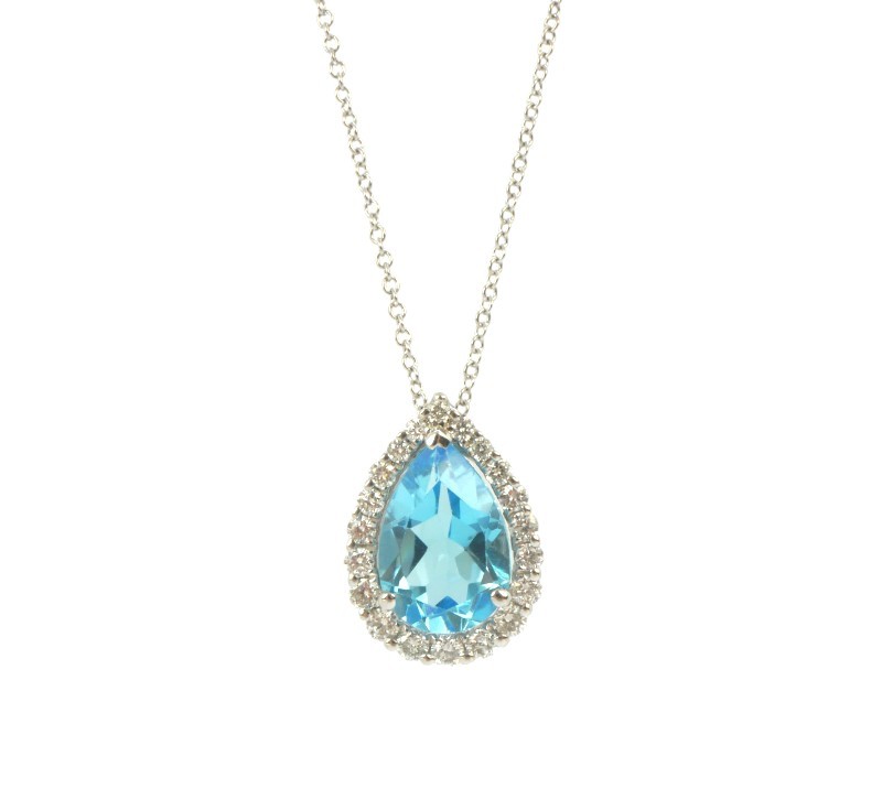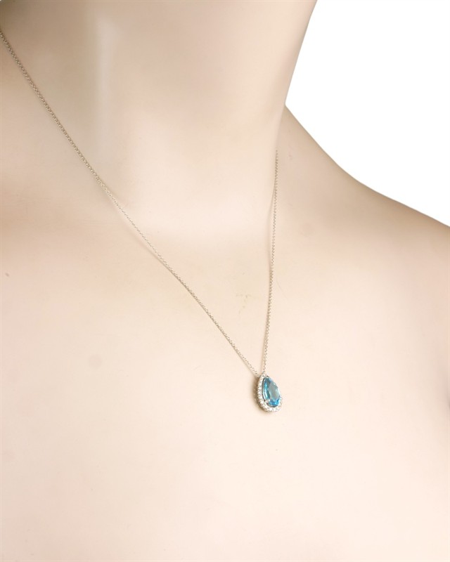 Náhrdelník z bílého zlata ryzosti 585/1000 s topazem o celkové hmotnosti 1,30 ct a diamanty briliantového brusu o celkové hmotnosti 0,20 ct. Celková hmotnost šperku je 1,74 g. Délka řetízku je 45 cm.