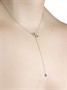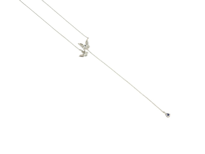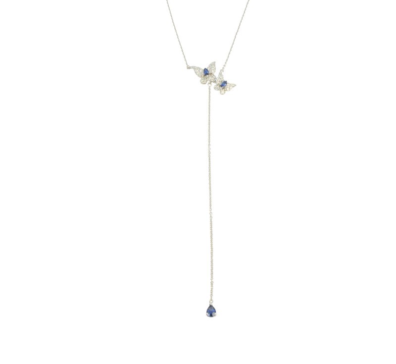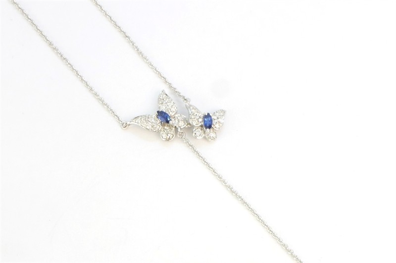 Náhrdelník z bílého zlata ryzosti 585/1000 se safíry o celkové hmotnosti 0,20 ct a diamanty briliantového brusu o celkové hmotnosti 0,15 ct. Celková hmotnost šperku je 2,43 g. Délka řetízku je 45 cm.