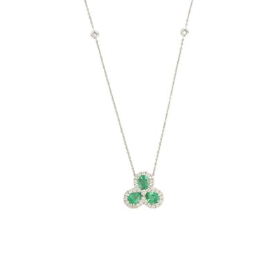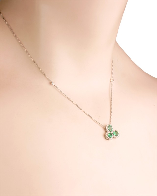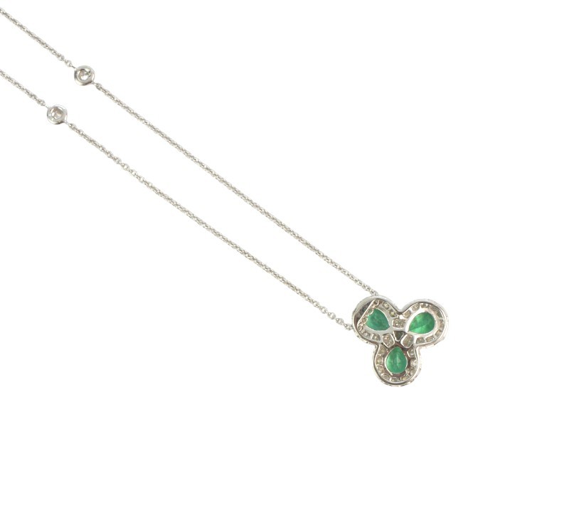 Náhrdelník z bílého zlata ryzosti 585/1000 se smaragdy a diamanty briliantového brusu o celkové hmotnosti 0,35 ct. Celková hmotnost šperku je 2,59 g. Délka řetízku je 45 cm.