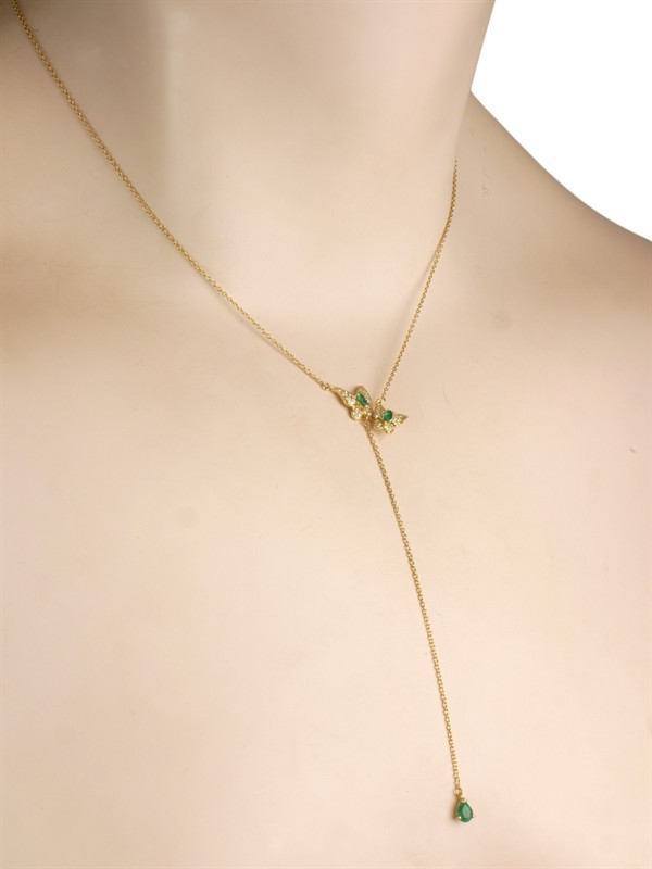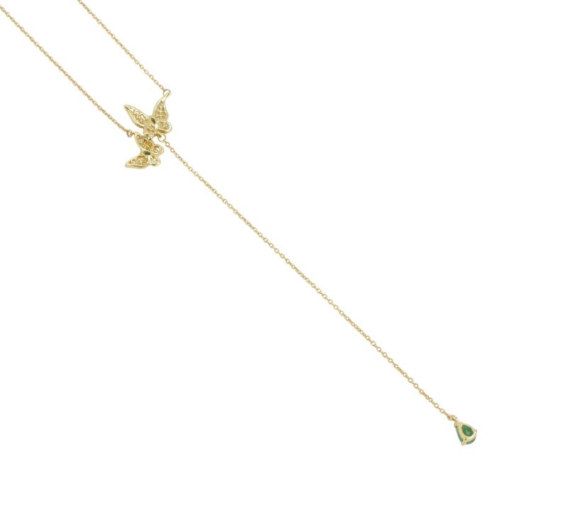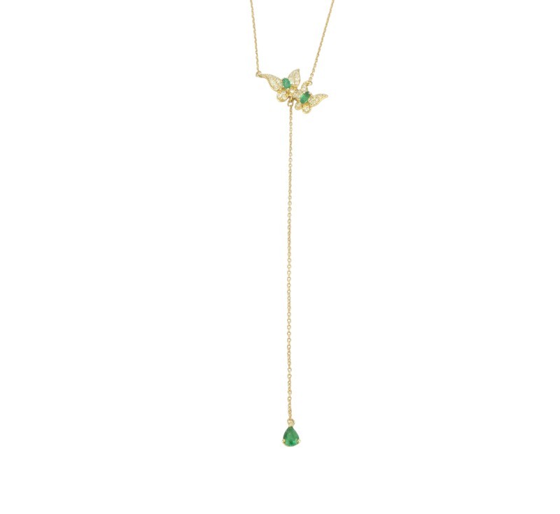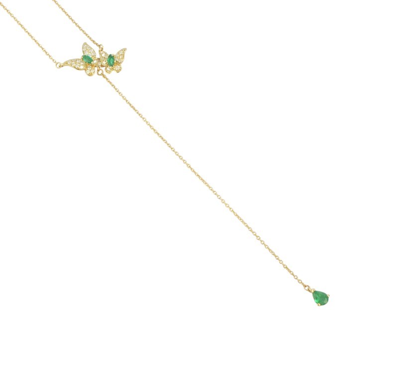 Náhrdelník ze žlutého zlata ryzosti 585/1000 se smaragdy o celkové hmotnosti 0,20 ct a diamanty briliantového brusu o celkové hmotnosti 0,15 ct. Celková hmotnost šperku je 2,37 g. Délka řetízku je 45 cm.