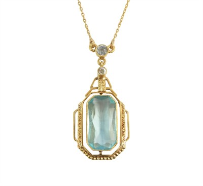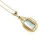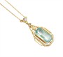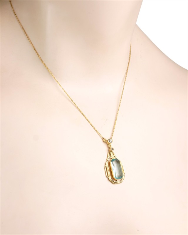 Náhrdelník ze žlutého zlata ryzosti 585/1000 (punc lvíček) se syntetickým spinelem a leukosafíry. Celková hmotnost šperku je 4,75 g. Délka řetízku 42,5 cm a délka závěsu 3,3 cm.