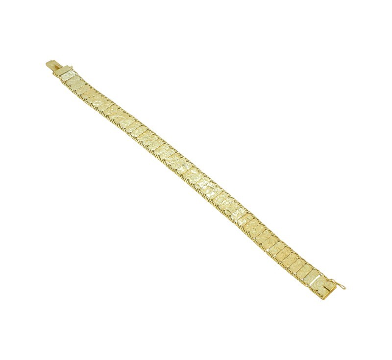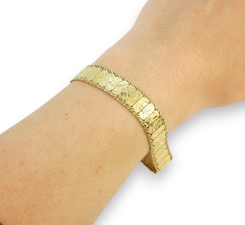 Velice jemně zdobený článkový náramek ze zlata ryzosti 585/1000. Délka 18,7 cm. Celková hmotnost 10,60 g.