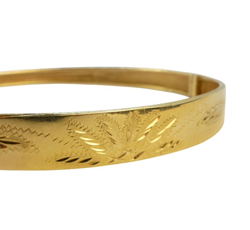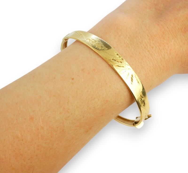 Jemně zdobený náramek ze zlata ryzosti 585/1000. Vnitřní rozměry náramku 7 x 6 cm. Celková hmotnost 9,94 g.