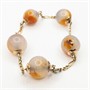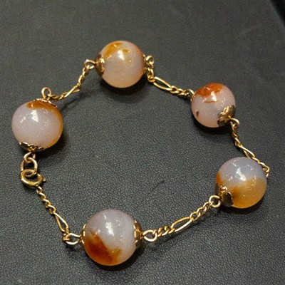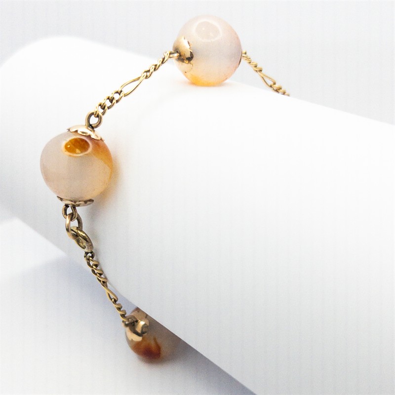 Starožitný Art deco zlatý náramek s acháty, pravděpodobně chalcedony karneolového typu s mléčně bílým až oranžovo-hnědým žíháním, jednotlivé kuličky jsou uchyceny do zlatých čepiček a spojeny článkovým řetízkem, náramek je typickým příkladem středoevropské výroby šperků stylu Art Deco, zlato o ryzosti 14 karátů 585/1000 o celkové hmotnosti 26,30 g, délka náramku: 22 cm