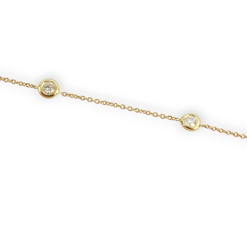 Náramek ze žlutého zlata ryzosti 585/1000 s diamanty briliantového brusu o celkové hmotnosti 0,20 ct. Celková hmotnost náramku je 1,20 g. Délka 18,5 cm.