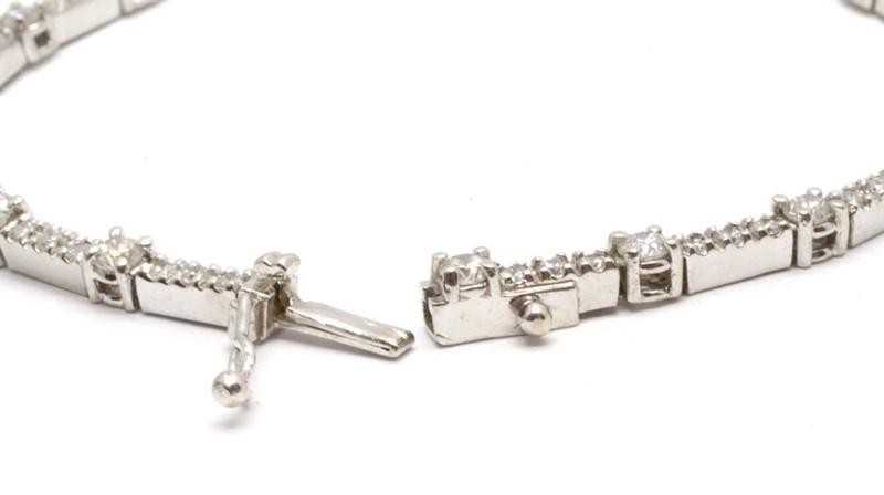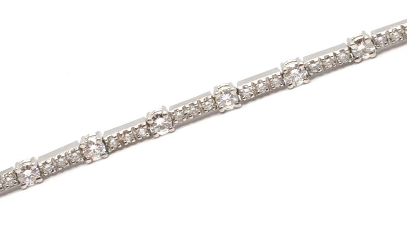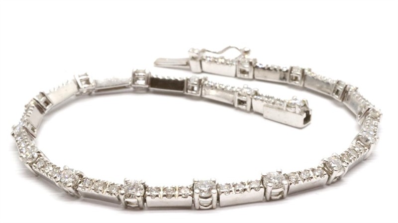 Zlatý náramek s diamanty. Bílé zlato 585/1000. Přírodní diamanty, kvalita SI1 - SI2, barva H - I, celková váha 2,99 ct. Váha náramku: 8,87 g. Délka náramku: 18 cm. K náramku je vypracován odborný posudek.