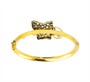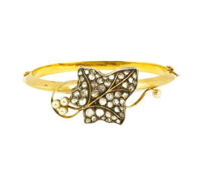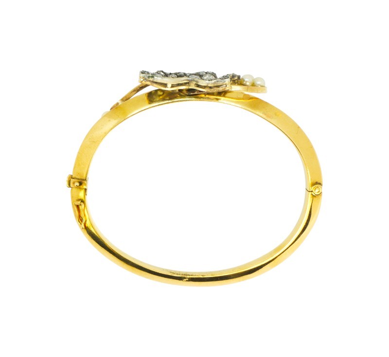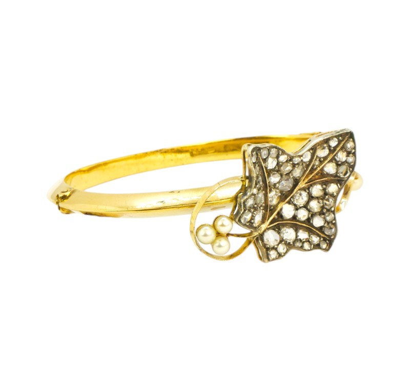 Náramek ze žlutého zlata je zhotoven ve tvaru břečťanového listu, který je osazen diamantovými routami a říčními perličkami. Celková hmotnost náramku je 21,73 g. 18 karátového zlata 750 / 1000, Vnitřní rozměry jsou 4,7 x 5,7 cm. Atest puncovního úřadu, Odborně zlatníkem vyčištěn, Krásná práce z počátku 20. století