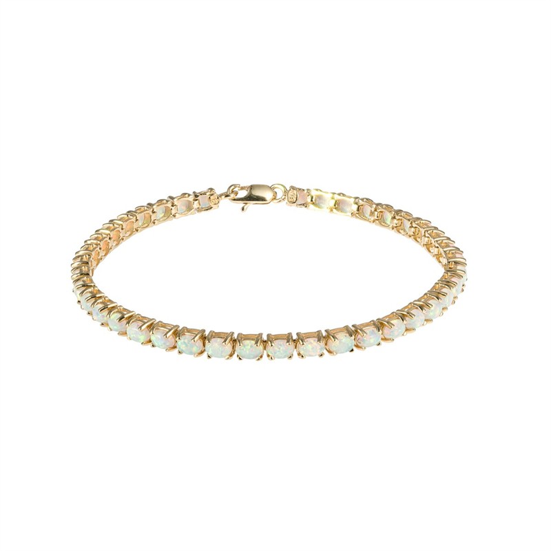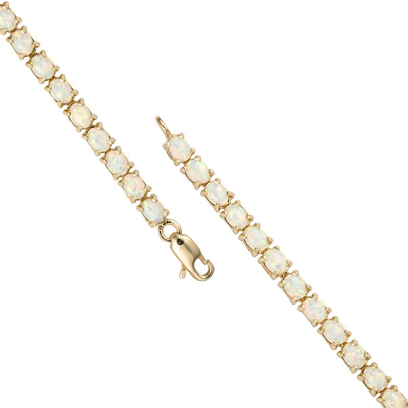Zlato o ryzosti 585/1000 váha 7,35 g délka 18 cm, šířka 0,3 cm syntetické opály 39 ks 3,9 ct výborný stav osvědčení puncovního úřadu kameny s garancí pravosti zkontrolované v gemologické laboratoři Nabízíme kompletní zlatnický servis na nejvyšší úrovni – od úprav velikostí a odborných oprav přes rhodiování, čištění, leštění až po výměnu kamenů a znalecké posudky. Vše přizpůsobíme vašim přáním.