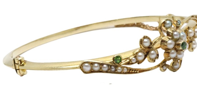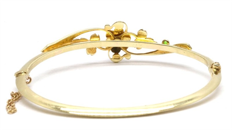 Zlatý náramek s přírodními kameny a perličkami. Žluté zlato 585/1000. Přírodní kameny. Perličky. Váha náramku: 10,87 g. Vnitřní rozměr náramku: 5,5 cm x 4,8 cm.