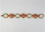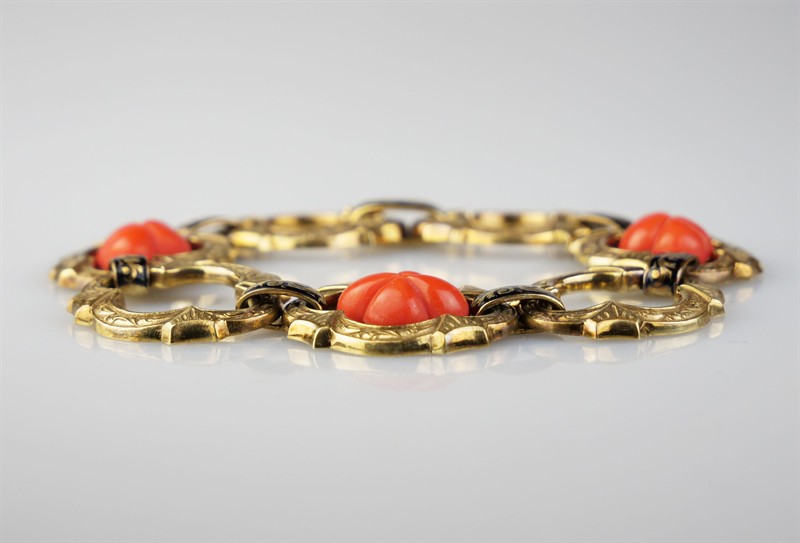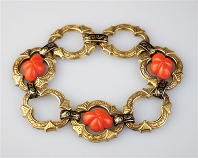 Zlatý článkový náramek s netradičně řezanými velkými přírodními korály a černým emailem. Celková hmotnost Au 30,38 g/585/1000, dovozový punc lyra (Z-34). Západní Evropa, první třetina 20. století, délka 19,5 cm, šířka 2,2 cm.