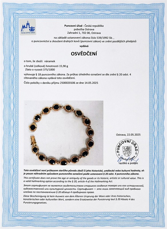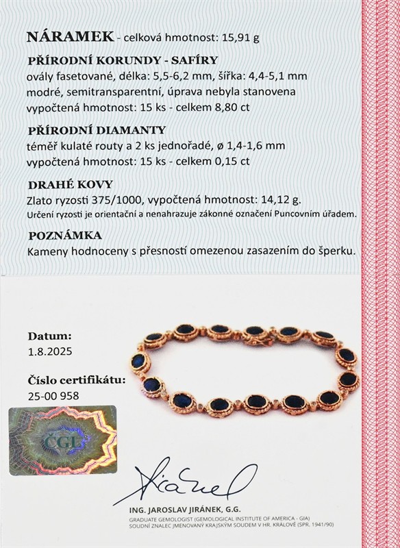 Zlato o ryzosti 375/1000 váha 15,9 g délka 18,5 cm, šířka 0,7 cm přírodní safír 15 ks 8,80 ct, délka 5,5-6,2 mm, šířka 4,4-5,1 mm přírodní malé diamantové routy 15 ks 0,15 ct, průměr 1,4-1,6 mm výborný stav certifikát z gemologické laboratoře je součástí šperku osvědčení puncovního úřadu