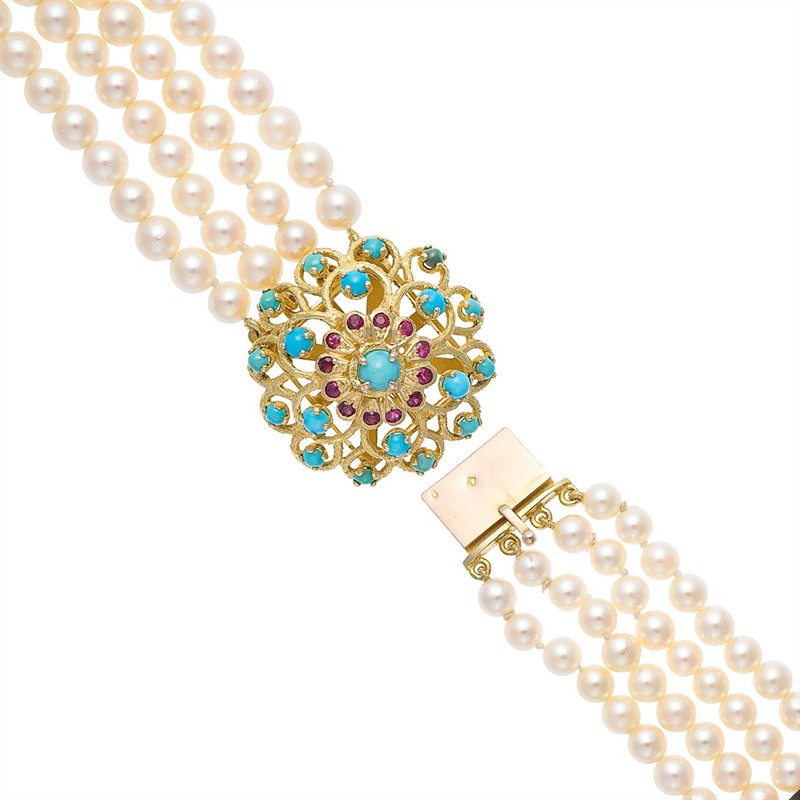 č. 182 147 Zlatý náramek s přírodními tyrkysy, rubíny a perlami