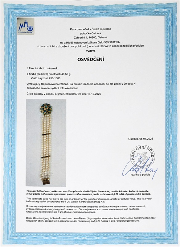 Doklady: - osvědčení Puncovního úřadu České republiky - certifikát pravosti - vystaven na základě kontroly gemologickou laboratoří, evidenční číslo kontroly je uvedeno v našem certifikátu