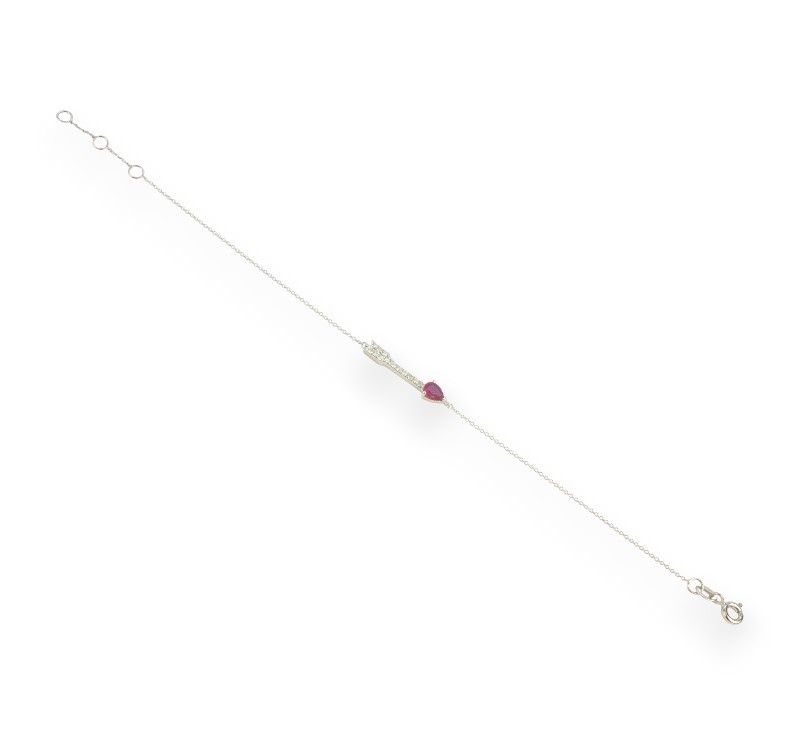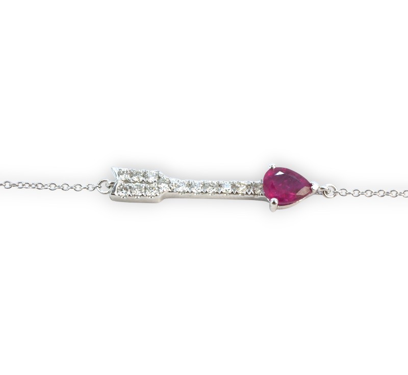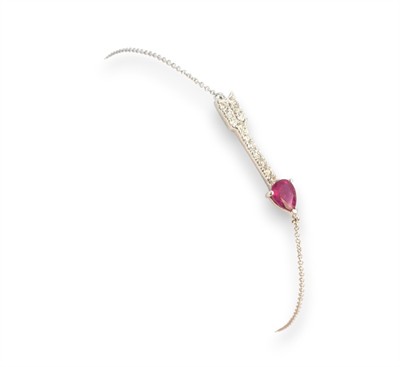 Náramek z bílého zlata ryzosti 585/1000 s rubínem a diamanty briliantového brusu o celkové hmotnosti 0,10 ct. Celková hmotnost náramku je 1,03 g. Délka 18,3 cm.
