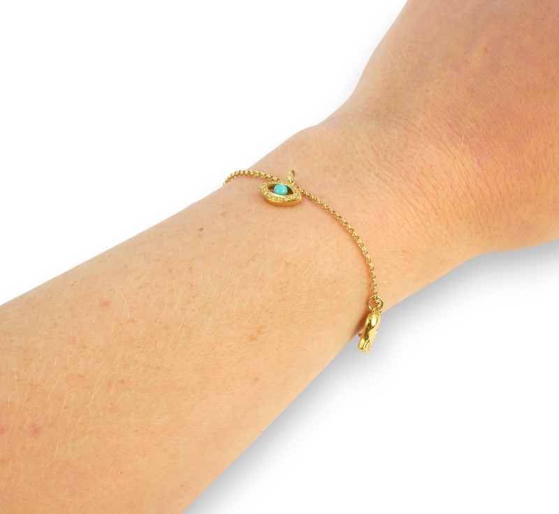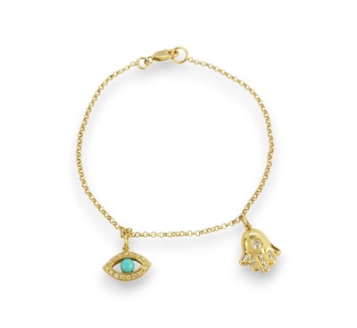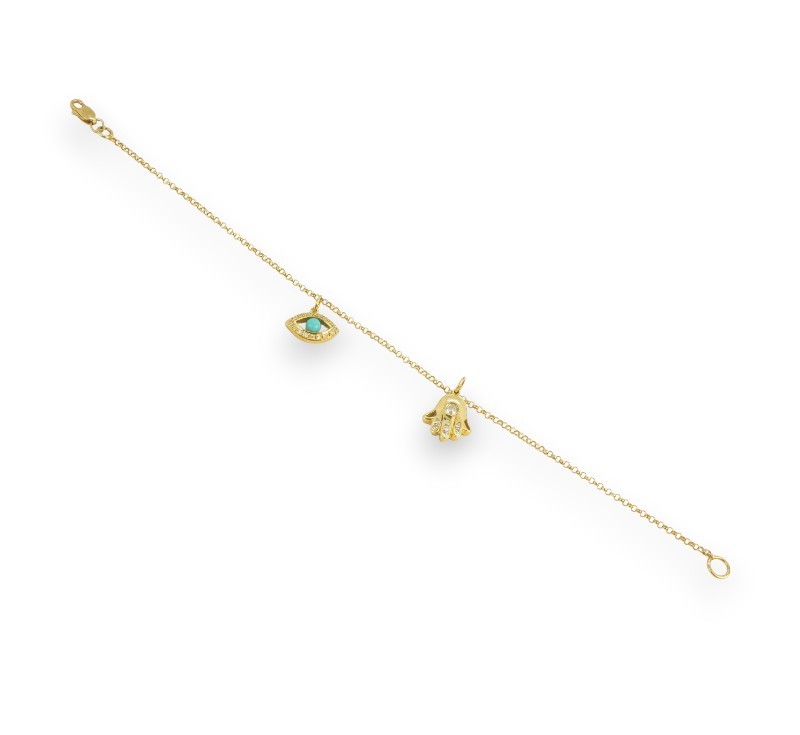 Náramek ze žlutého zlata ryzosti 750/1000 s tyrkysy a diamanty briliantového brusu o celkové hmotnosti 0,20 ct. Celková hmotnost šperku je 3,30 g. Délka náramku je 18,5 cm.