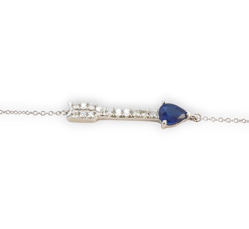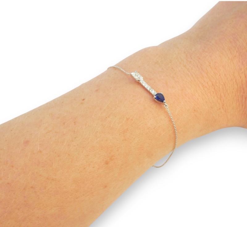 Náramek z bílého zlata ryzosti 585/1000 se safírem a diamanty briliantového brusu o celkové hmotnosti 0,10 ct. Celková hmotnost náramku je 1,05 g. Délka 18,3 cm.
