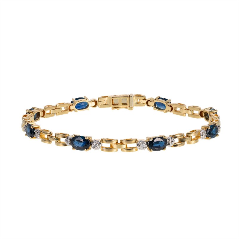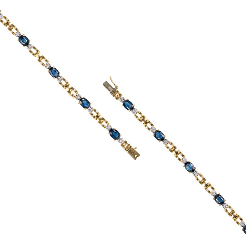 Žluté zlato o ryzosti 750/1000 váha 9,9 g safíry cca 4,4 ct diamanty cca 0,11 ct délka 17,3 cm, šířka 0,4 cm výborný stav puncované platným puncem kameny s garancí pravosti zkontrolované v gemologické laboratoři