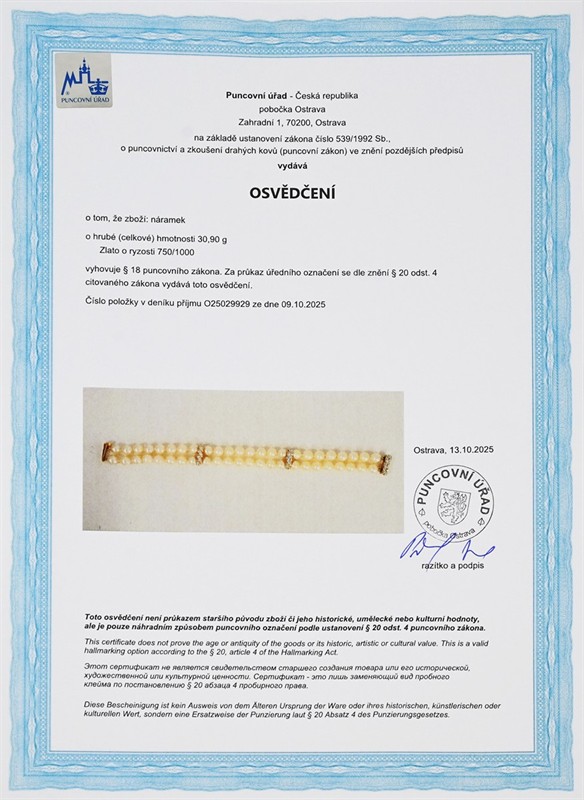 Materiál: žluté zlato o ryzosti 750/1000 Hmotnost: 30,90 g Rozměry: délka 19,5 cm, šířka 1,4 cm Drahokamy: 48 ks kultivovaných perel Akoya, krémové, průměr 7,0-7,5 mm 18 ks přírodních diamantů, 0,20 ct celkem, bílý (G-H-I), čistota VS - SI1 Stav: výborný Doklady: Osvědčení Puncovního úřadu České republiky Certifikát z gemologické laboratoře je součástí šperku Pro vaše maximální pohodlí nabízíme kompletní zlatnický servis: úpravy velikosti, odborné opravy, rhodiování, výměny kamenů, profesionální čištění, leštění i znalecké odhady. Vše přizpůsobíme vašim přáním.