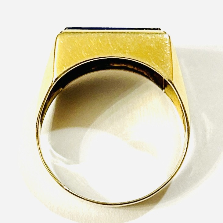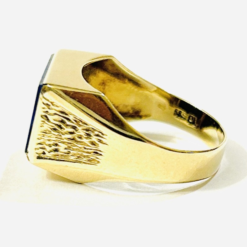 Elegantní, robustnější pánský prsten, hlavici dominuje přírodní lapis lazuli obdélného plochého brusu, široká ramena šíny s plastickým organickým dekorem poplatném dobovému brutalismu. Německá zlatnická práce ze 70. let 20. století. Zhotoveno ze žlutého 14 karátového zlata, tj. o ryzosti 585/1000; nově opatřeno puncem Z-58 (labuť 4), ryzostní číslo a značka výrobce "PL" zevnitř šíny. Hmotnost 5,29 g, velikost 64, délka hlavice 15 mm, šířka 10,5 mm. Kámen velmi lehce uvolněný, není však vadou proti dennímu nošení, celkově jinak v zachovalém stavu.
