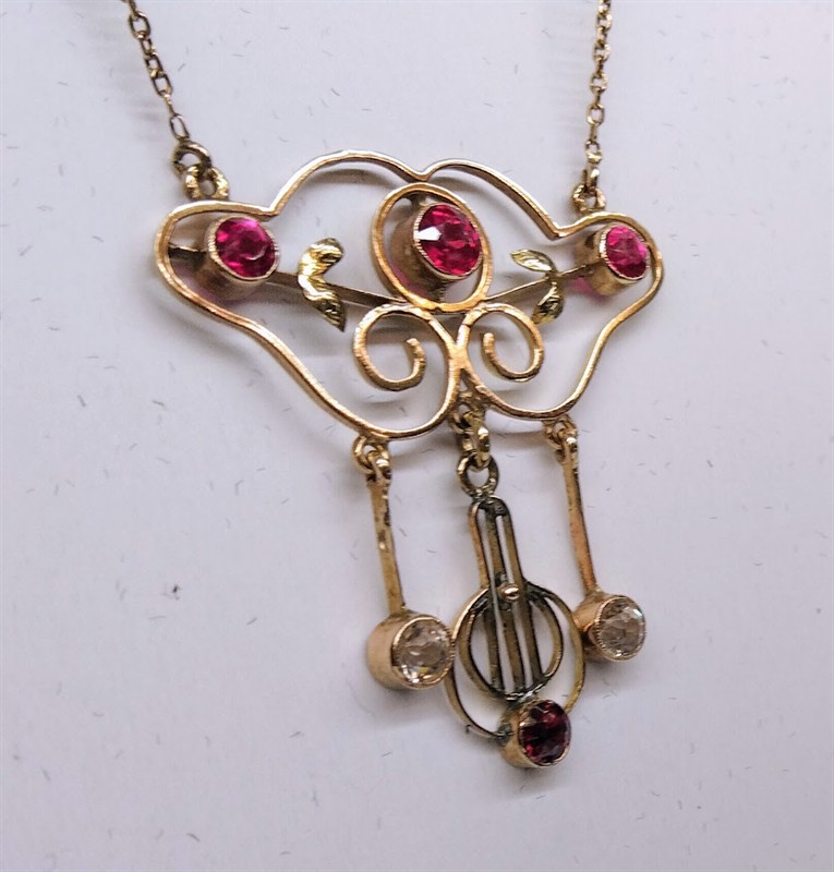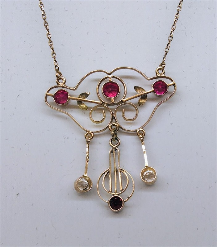 Zlatý postsecesní náhrdelník s rubíny a leukosafíry