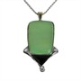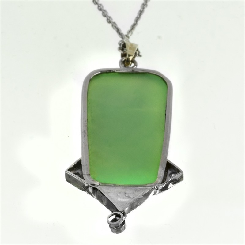 Zlatý přívěsek zdobený velkým jadeitem, smaltem a drobnými brilianty. Au 585/1000, hmotnost: 9,25g, brilianty 0,10 ct. Čechy, 20 léta 20. století. Délka řetízku: 44 cm, přívěs s očkem 4,8 cm, bez očka4cm, šířka: 2cm.