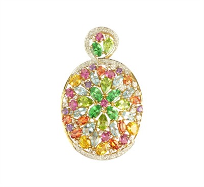 Grandiózní, extravagantní oválný závěs s kulatou provlékací částí, osázeno pestrobarevnou kombinací přírodních drahých kamenů (žlutý safír, 1,80 ct - 4 ks; oranžový safír, 1,80 ct - 8 ks; akvamarín, 1,90 ct - 9 ks; purpurový turmalín, 1,10 ct - 8 ks; tsavorit, 2,50 ct - 5 ks; ametysty, 0,70 ct - 6 ks; olivín, 2,10 ct - 5 ks) kulatých, oválných, kapkových a naveta brusů. Doplněno 53 čirými kameny kulatého brusu fasovaných v lůžkách z bílého zlata, pečlivě fasováno krapnami. Svěží, hravý šperk, západoevropská zlatnická práce z první pětiny 21. století. Zhotoveno ze žlutého 9 karátového zlata, tj. o ryzosti 375/1000; nově opatřeno puncem punc Z-59 (písmeno Z s alchymistickou růží) a ryzostní číslo zezadu. Hmotnost 9,06 g, délka 51 mm, šířka 32 mm. V zachovalém stavu, odborně vyčištěno a vyleštěno zlatníkem. Součástí odborný posudek.
