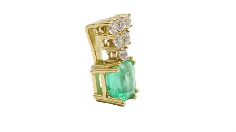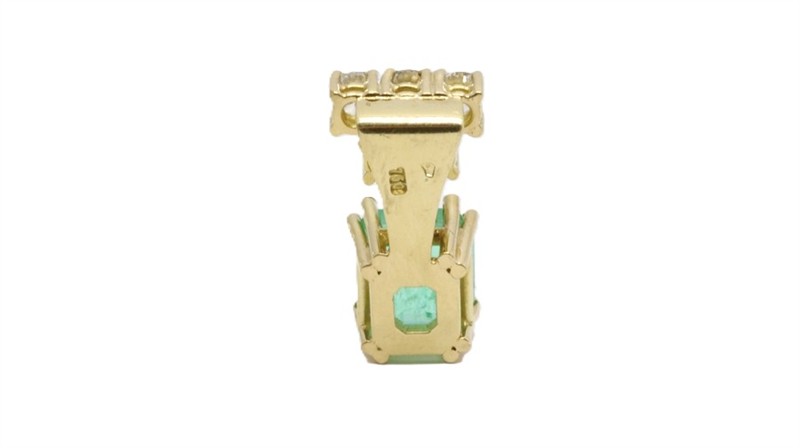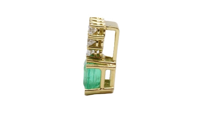 Zlatý přívěsek s diamanty a smaragdem. Žluté zlato 750/1000. Přírodní diamanty, kvalita SI1 - SI2, barva G - I, celková váha 0,5 ct. Přírodní smaragd 1,85 ct. Váha přívěsku: 3,02 g. Velikost přívěsku: 1,5 x 0,8 cm.