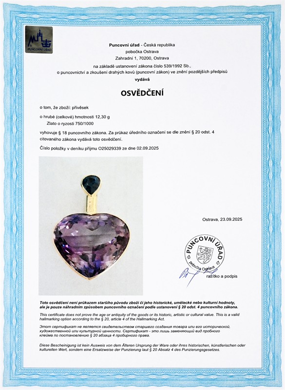 č. 179 734 Zlatý přívěsek s přírodním ametystem a přírodním safírem