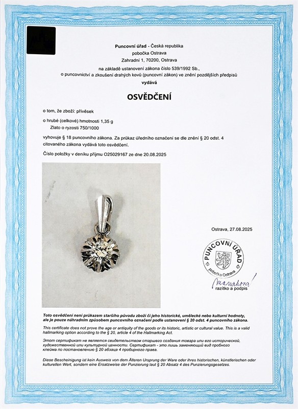 č. 182 202 Zlatý přívěsek s přírodním diamantem 0,30 ct
