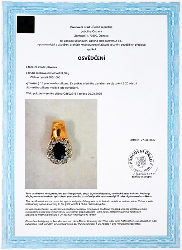 č. 179 733 Zlatý přívěsek s přírodním safírem a diamanty