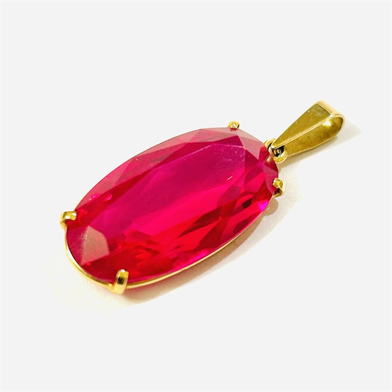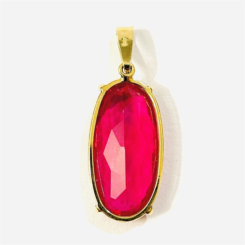 Větší, minimalistický přívěšek, jehož dominantou je syntetický rubín oválného brusu, díky důmyslnému fasování 4 krapnami není obruba z přední strany téměř vidět. Precizní tuzemská zlatnická práce z počátku 21. století. Zhotoveno ze žlutého 14 karátového zlata, tj. o ryzosti 585/1000; punc Z-58 (labuť 4) a mistrovská značka na očku. Hmotnost 5,28 g, délka 36 mm, šířka 13 mm. Téměř nenošeno, ve velmi zachovalém stavu, odborně vyčištěno a vyleštěno zlatníkem.