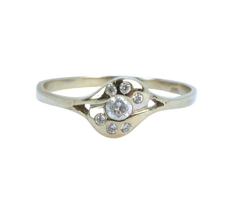 Prsten z bílého zlata ryzosti 585/1000, je zdoben zirkony. Hmotnost prstenu 1,31 g, velikost 53.