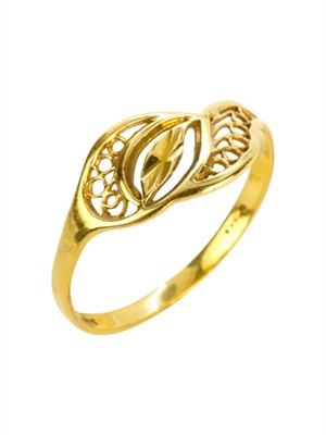 Prsten vyrobený ze žlutého zlata ryzosti 585/1000 zdobí jemně prořezávaná hlava. Velikost prstenu 61, hmotnost 1,48 g.