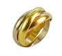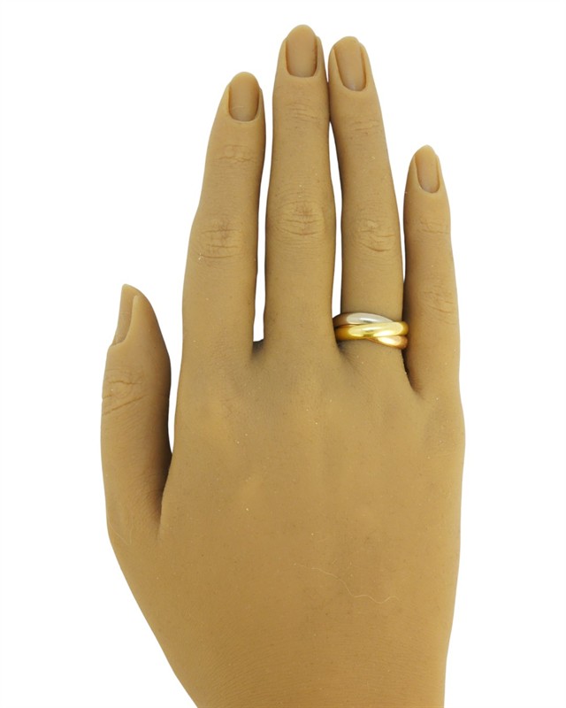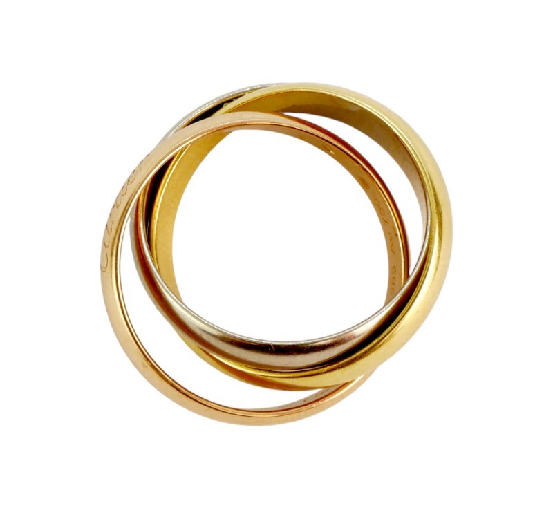 Prsten Trinity značky Cartier je zhotoven ze tří kroužků - z bílého, žlutého a růžového zlata ryzosti 750/1000. K prstenu je originální Cartier krabička. Celková hmotnost je 8,15 g. Velikost 51.