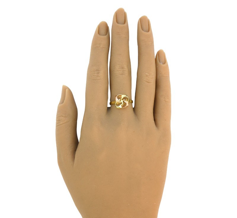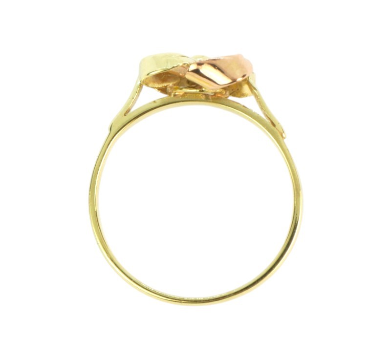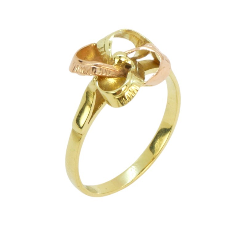 Prsten z dvojího zlata s hlavou tvarovanou do podoby mašle. Zlato ryzost 585/1000, hmotnost 2,35 g.