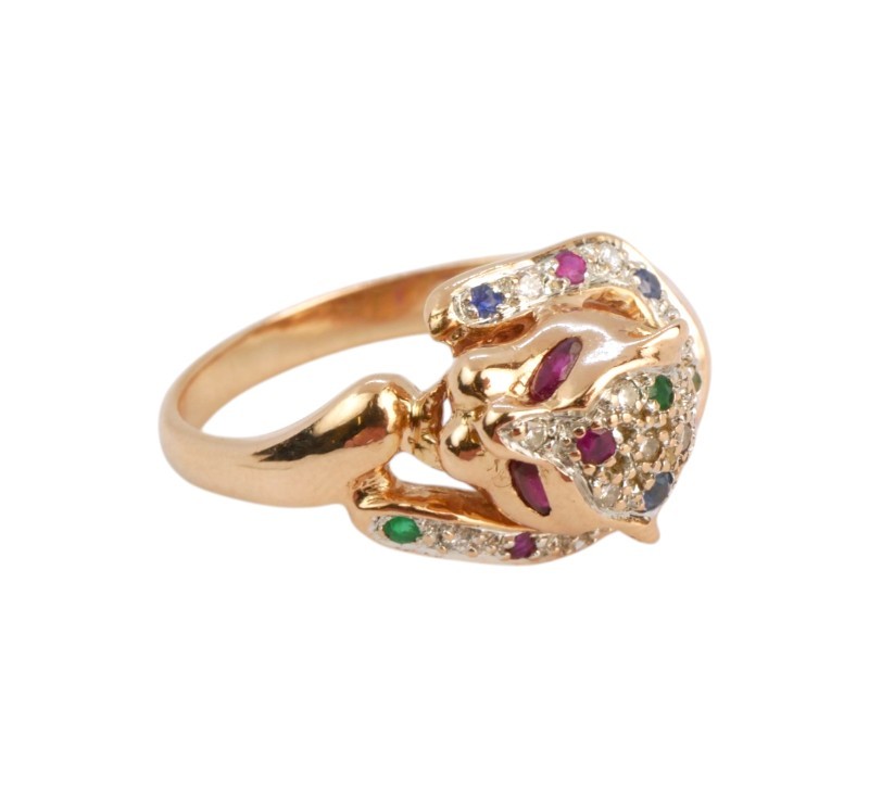 Zlatý prsten ve tvaru pantera inspirovaný stylem Cartier je vyrobený ze zlata ryzosti 585/1000 (punc labuť) zdobený diamanty, safíry, smaragdy a rubíny. Velikost 57. Hmotnost 5,6 g.
