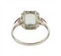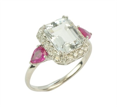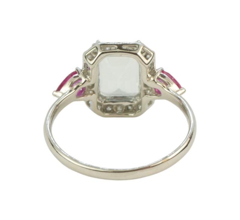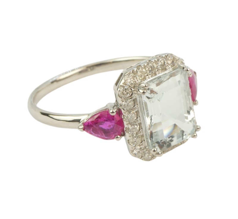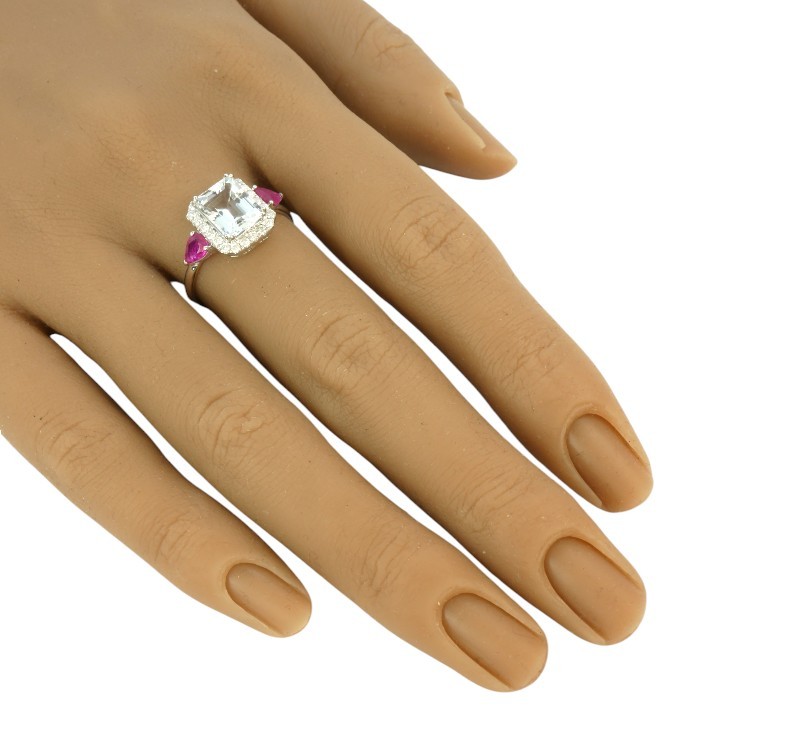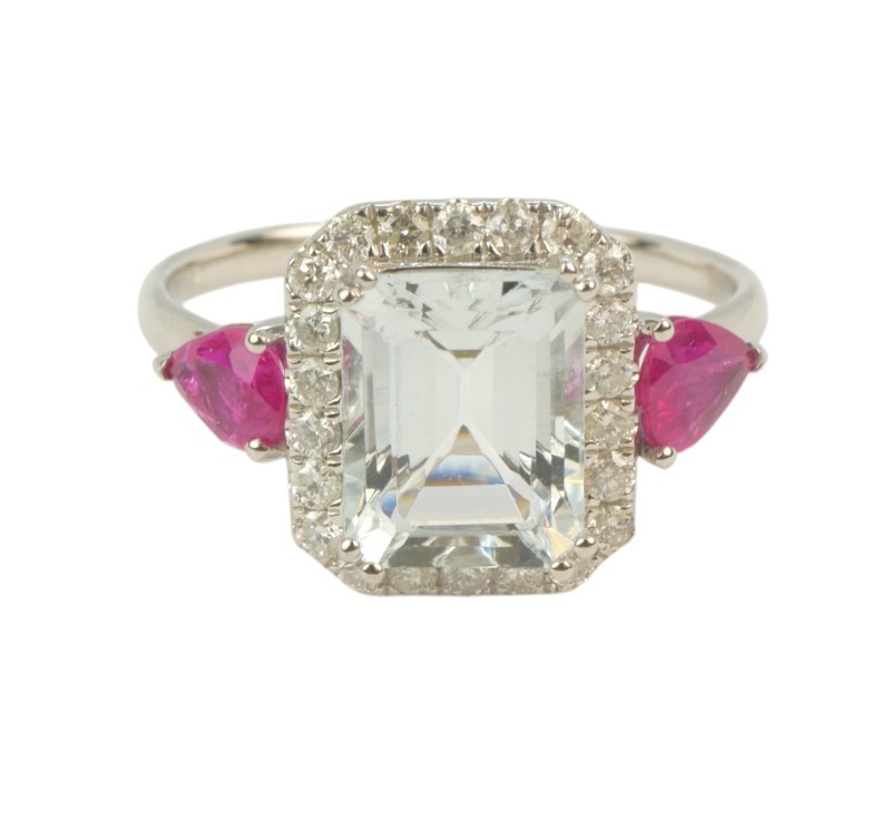 Prsten z bílého zlata ryzosti 585/1000 osazený rubíny o celkové hmotnosti 0,40 ct, diamanty briliantového brusu o celkové hmotnosti 0,30 ct a velkým přírodním akvamarínem o hmotnosti 1,60 ct. Celková hmotnost prstenu je 2,78 g. Velikost 56.