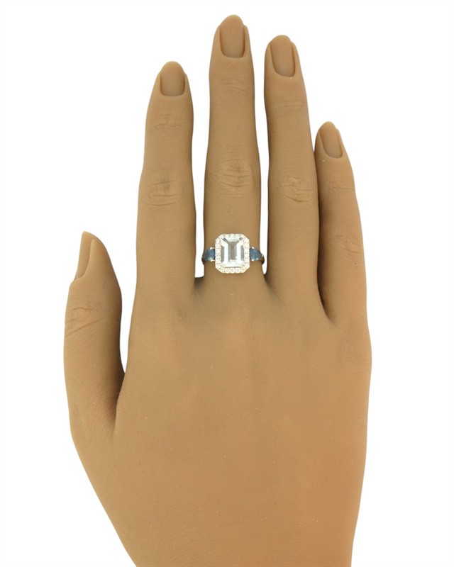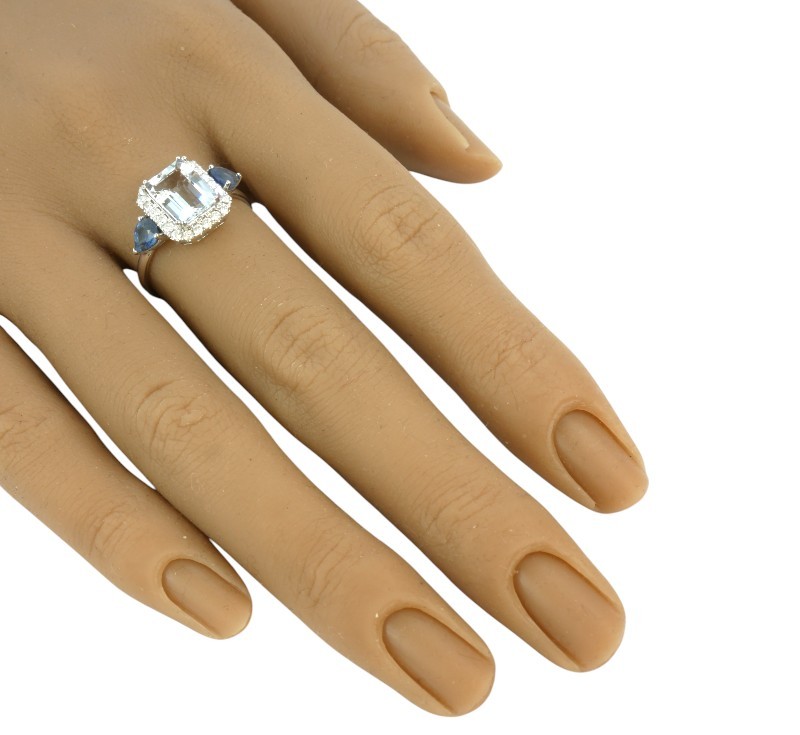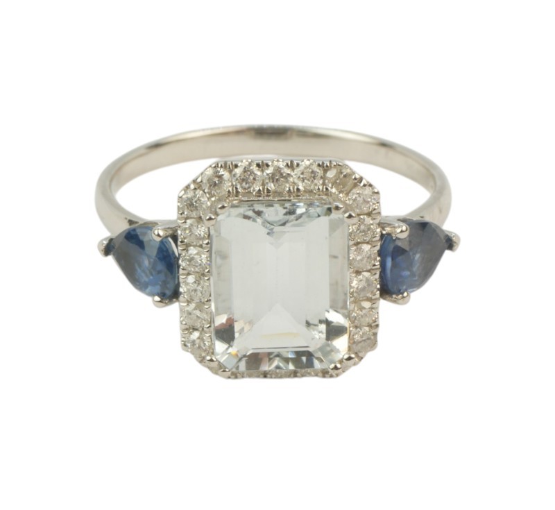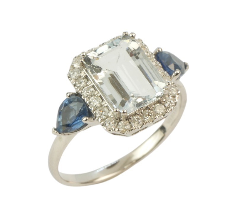 Prsten z bílého zlata ryzosti 585/1000 osazený safíry o celkové hmotnosti 0,70 ct, diamanty briliantového brusu o celkové hmotnosti 0,30 ct a velkým přírodním akvamarínem o hmotnosti 1,60 ct. Celková hmotnost prstenu je 2,79 g. Velikost 56.