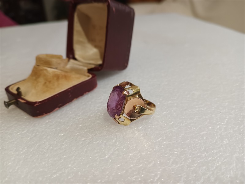 Prsten vyrobený ze zlata ryzosti 585/1000 , s ametystem . Velikost 54 . Hlava prstenu má rozměry 2 x 1,5 cm. Hmotnost 5,42 gr .