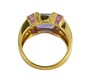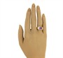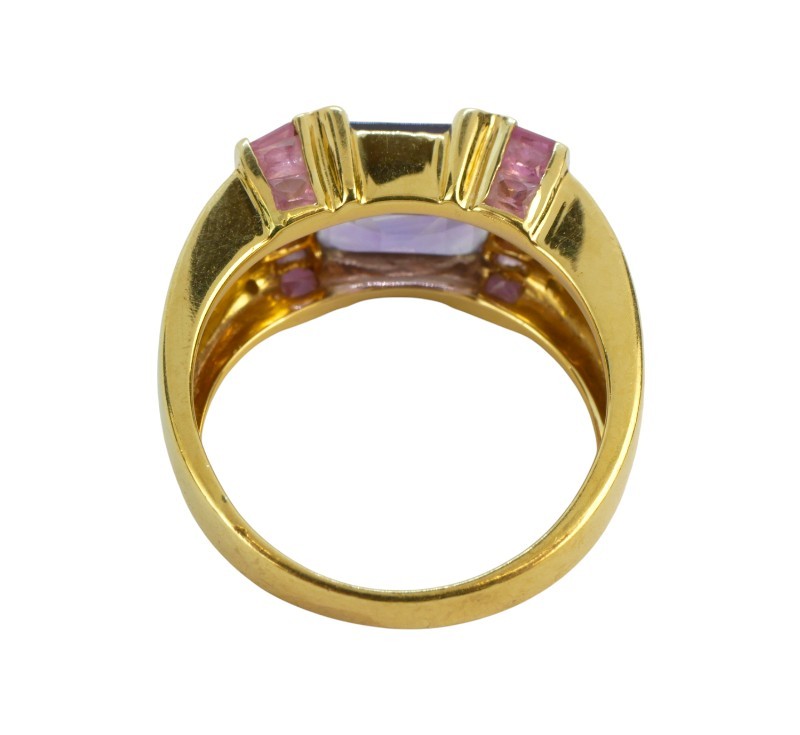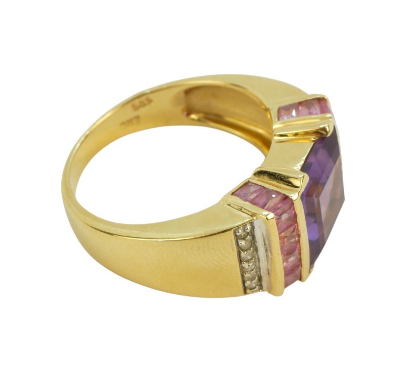 Prsten ze žlutého zlata ryzosti 585/1000 zdobený fialovým ametystem, po stranách jsou zasazeny drobounké růžové ametysty a brilianty. Velikost prstenu 54, celková hmotnost 5,64 g.