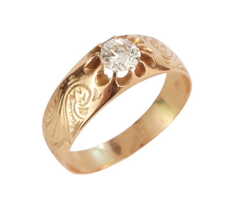 Prsten z růžového zlata ryzosti 585/1000 je osazen diamantem hmotnosti cca 0,40 ct, obroučka po stranách zdobena gravírováním. Rakousko-Uhersko. Celková hmotnost prstenu je 2,58 g a jeho velikost je 56.