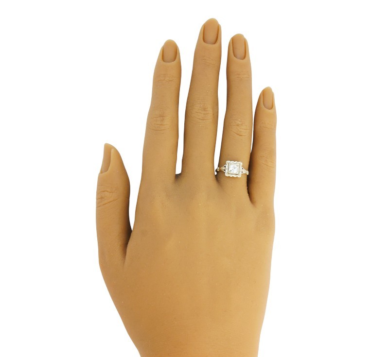 Prsten vyrobený z bílého zlata ryzosti 585/1000 osazený briliantem hmotnosti cca 0,40 ct. Mistrovská značka KF. Celková hmotnost prstenu 1,67 g, velikost 51. Prsten typické art deco fazóny z 30. let 20. století.