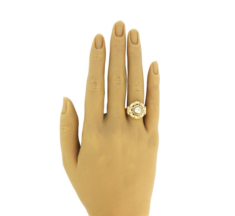 Prsten v kombinaci žlutého a růžového zlata zdobí centrální diamant starého briliantového brusu (cca 0,20 ct). Zlato ryzosti 585/1000. Velikost prstenu 55, celková hmotnost 5,50 g. Jedná se o starožitný prsten z první poloviny 20. století, Puncovní úřad k němu vydal Osvědčení.