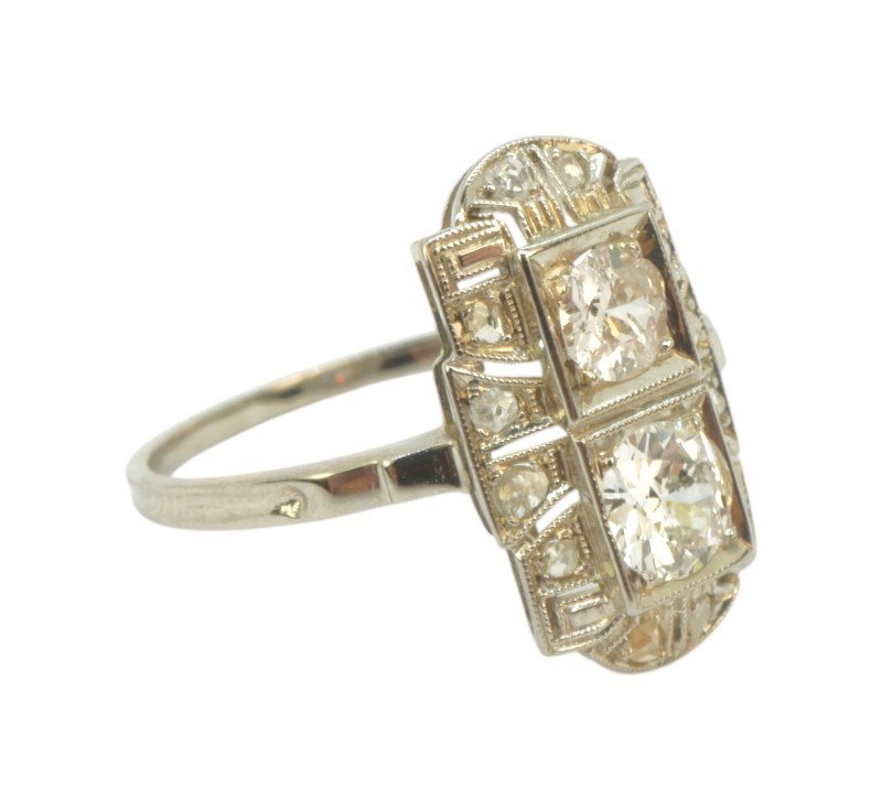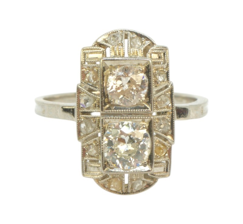 Starožitný zlatý prsten s brilianty 0,73 ct Zlato ryzost 585/1000, hmotnost prstenu 2,47 g. Prsten je osazen dvěmi středovými brilianty o hmotnosti 0,37 ct a 0,24 ct a diamantovými routami. Velikost prstenu 54.