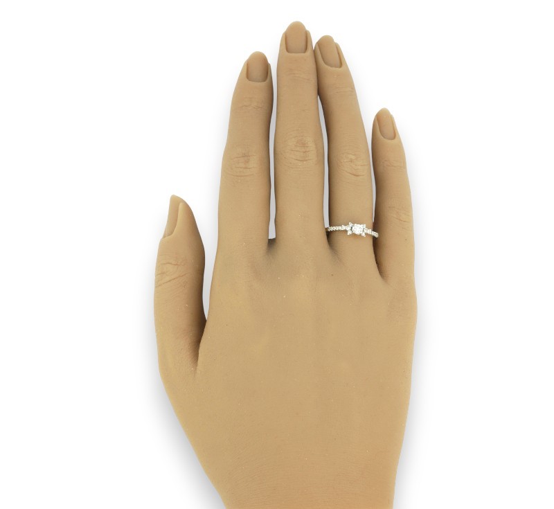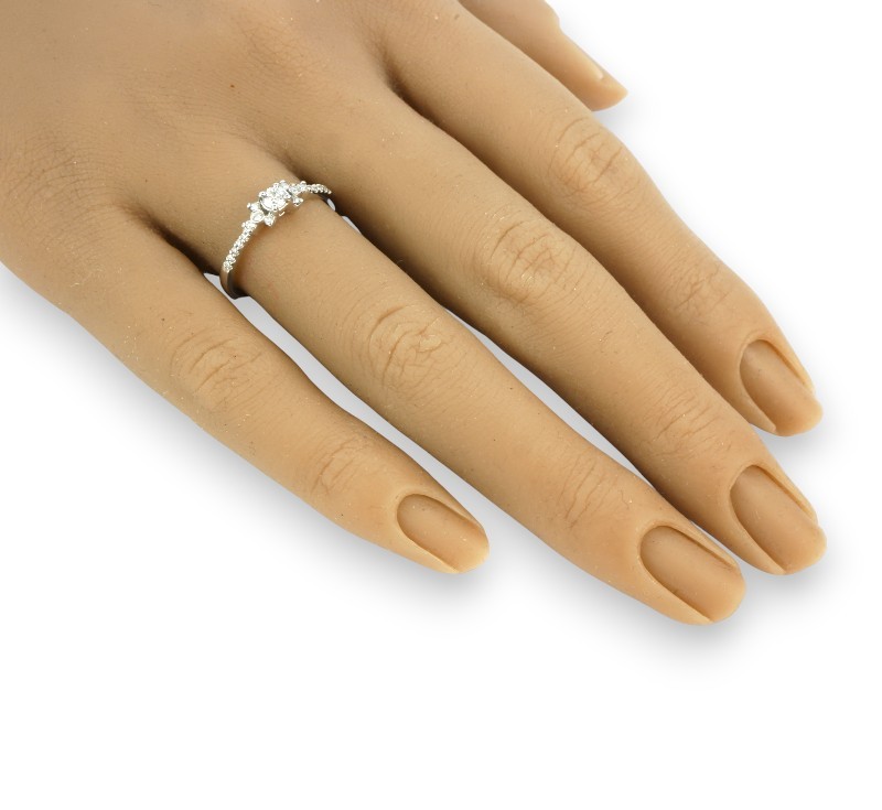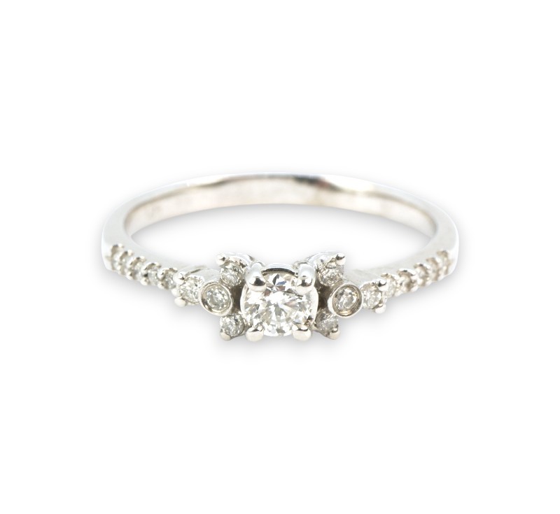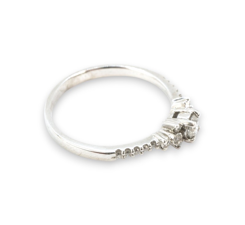 Prsten z bílého zlata ryzosti 585/1000 s diamanty briliantového brusu o celkové hmotnosti 0,25 ct. Celková hmotnost prstenu je 2,10 g. Velikost 54.