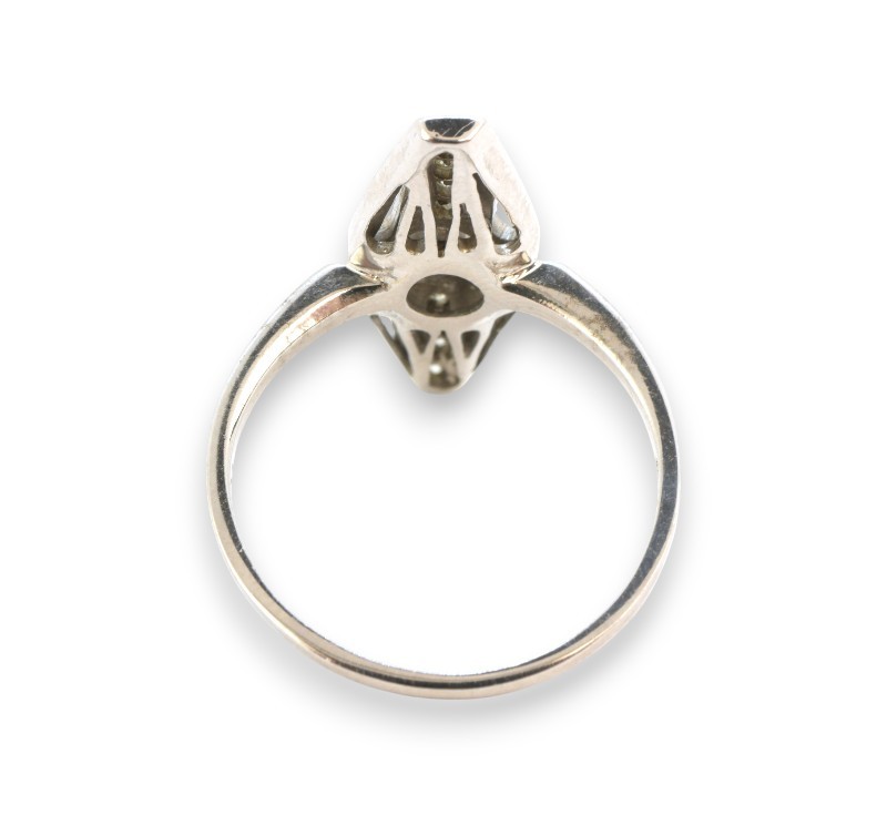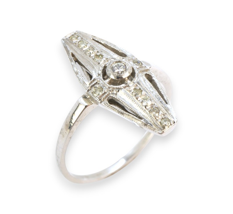 Prsten z bílého zlata ryzosti 585/1000 s diamanty briliantového brusu o celkové hmotnosti 0,15 ct. Celková hmotnost prstenu je 2,70 g. Velikost 53.