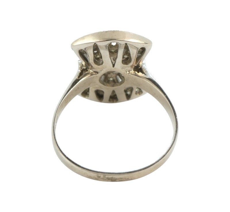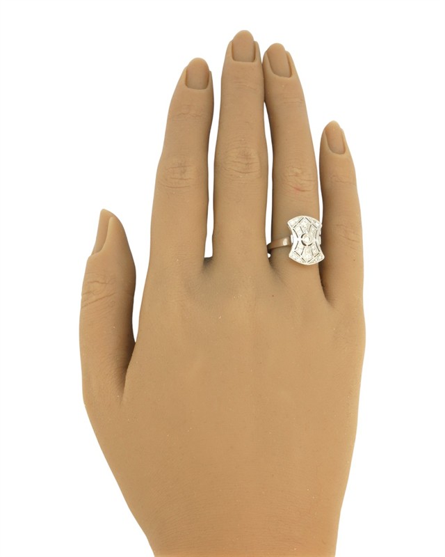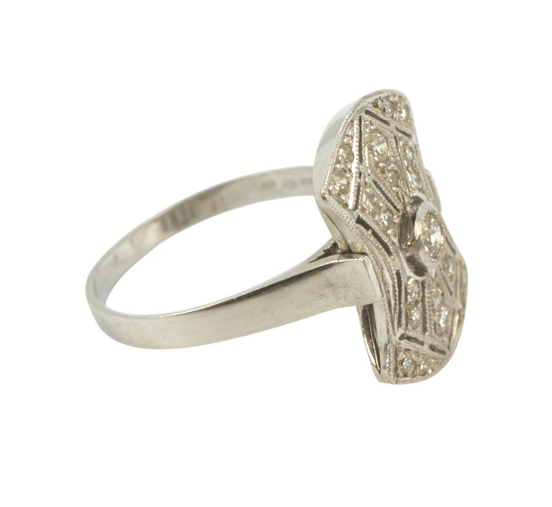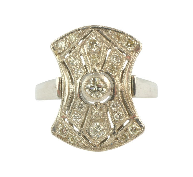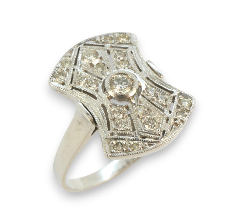 Prsten z bílého zlata ryzosti 585/1000 s diamanty briliantového brusu o celkové hmotnosti 0,30 ct. Celková hmotnost prstenu je 3,30 g. Velikost 53.